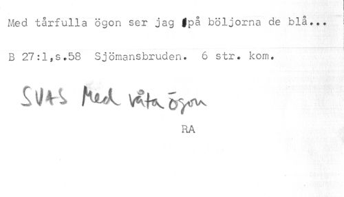 //// Med tårfulla ögon ser jag fpå böljorna de blå... //// B 27:l?s.58 Sjömansbruden. 6 str. kom. //// iSyr^ //// RA ////