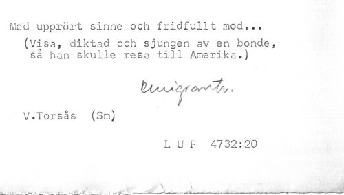//// Med upprört sinne och fridfullt mod... //// (Visa, diktad och sjungen av en bonde, //// så han skulle resa till Amerika.) //// V.Torsås (Sm) //// L U F 4732:20 ////