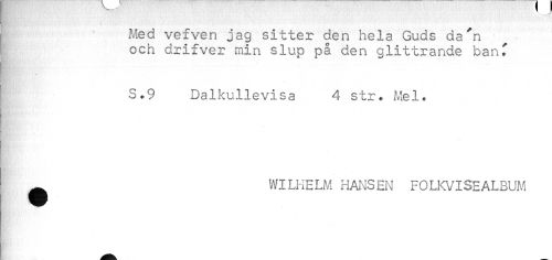 //// Med vefven jag sitter den hela Guds da'n //// och drifver min slup på den glittrande banf //// S.9 Dalkullevisa 4 str. Mel, //// - //// ^ WILHELM HANSEN FOLKVISEALBUM ////