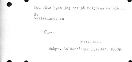 //// Med våta ögon jag ser på böljorna de blå... //// Bo //// * //// Västerlanda sn //// MORD. ms. //// Mskpt. Soldatsånger I,s,347. 18039. ////