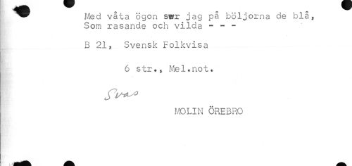 //// ^^ Med våta ögon swr jag på böljorna de blå, //// Som rasande och vilda - - - //// B 21, Svensk Folkvisa //// 6 str.. Mel.not. //// MOLIN ÖREBRO ////