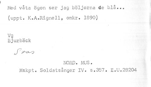 //// Med våta ögon ser jag böljorna de blå... //// (uppt. K.A.Rignell, omkr. 1890) //// Vg //// Bjurbäck //// NORD. ms. //// Mskpt., Soldatsånger IV. s.357. E.U.28204 ////