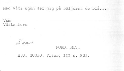 //// Med våta ögon ser jag på böljorna de blå... //// Vsm //// Västanfors //// NORD. MUS. //// E.U. 20310. Visor, III s. 831. ////