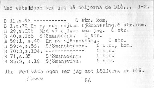 //// Med våtaEögon ser jag på böljorna de bla... 1-2. //// B ll.s.93------ 6 str. kom. //// B l,s.72 En ny och nöjsam sjömanssång.6 str.kom. //// B 29,s.206 Med våta^ögon ser jag. 6 str. //// B 40,s.166 Sjömanssång. 6 str. //// B 58:1, s.40 En ny sjömanssång. 6 str. //// B 59:4,s.56. Sjömansbruden. 6 str., kom. //// B 70:3,s.104. ------ 6 str. //// B 71,s.35 Sjömanssång. 6 str. //// B 85:2, s.18 Sjömansvisa. 6 str. //// ' . [ //// Jfr Med våta ögon ser jag mot böljorna de blå. //// KA //// ! ////