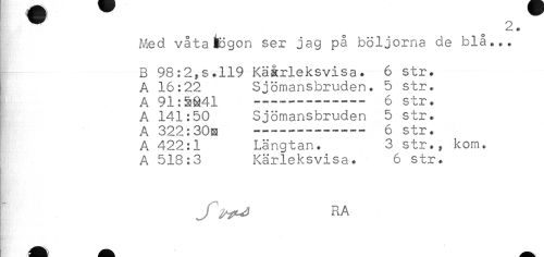 //// ^ 2. //// * //// Med våtaåögon ser jag på böljorna de blå... //// B 98:2,s.119 Käårleksvisa. 6 str. //// A 16:22 Sjömansbruden. 5 str. //// A 91:5841 ---6 str. //// A 141:50 Sjömansbruden 5 str. //// A 322:308 ------6 str. //// A 422:1 Längtan. 3 str., kom. //// A 518:3 Kärleksvisa. 6 str. //// RA //// . //// " //// ty ^^t ////