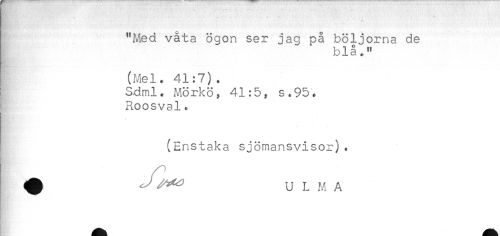 //// . . . ' * //// "Med våta ögon ser jag på böljorna de //// blå." //// (Mel. 41:7)< //// Sdml. Mörkö, 41s.95, //// Roosval* //// (Enstaka sjömansvisor)< //// ^ ULMA ////