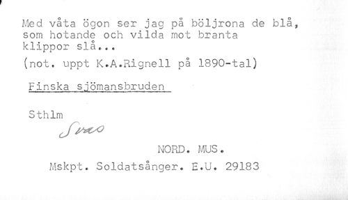 //// Med våta ögon ser jag på böljrona de blå, //// som hotande och vilda mot branta //// klippor slå... //// (not. uppt K.A.Rignell på 1890-tal) //// Finska sjömansbruden //// Sthlm //// NORD. MUS. //// Mskpt. Soldatsånger. E.U. 29183 ////