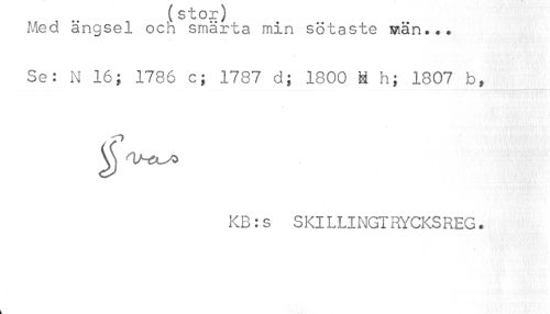 //// Med ängsel och smärta min sötaste Män... //// Se: N 16; 1786 c; 1787 d; 1800 ä h; 1807 b, //// KB:s SKILLINGIRYCKSREG. //// k ////