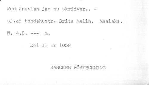 //// Med ängslan jag nu skrifver.. - //// sj.af bondehustr. Brita Malin. Maalaks, //// W. 4.8, --- m. //// Del II nr 1058 //// 4 //// RANCKEN FÖRTECKNING //// . - / . /Uti.' ////