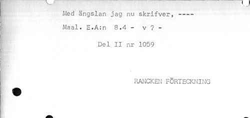 //// Med ängslan jag nu skrifver, ---- //// Maal* E*A:n 8.4- v?- //// Del II nr 1059 //// § ' ' //// $ //// RANCKEN FÖRTECKNING ////