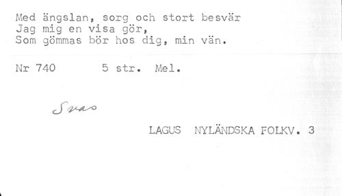 //// Med ängslan, sorg och stort besvär //// Jag mig en visa gör, //// Som gömmas bör hos dig, min vän. //// Nr 740 5 str. Mel. //// LAGUS NYLÄNDSKA FOLKV. 3 ////