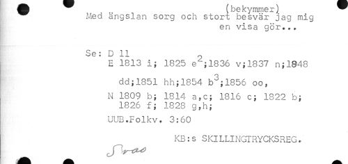 //// I]]]])? JJC K. y HUfiH J. J //// ^ ?^ed ängslan sorg och stort besvär jag mig //// en visa gör... //// Se: D 11 //// E 1813 i; 1825 e^;1836 v;1837 n;1848 //// dd;1851 hh;1854 b^;1856 oo, //// ! N 1809 b; 1814 a,c; 1816 c; 1822 b; //// 1826 f; 1828 g,h; //// UUB.Folkv. 3:60 //// KB:s SKILLINGIRYCKSREG. ////