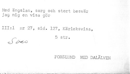 //// Med ängslan, sorg och stort besvär //// jag mig en visa gör //// 111:1 nr 27, sid. 127, Kärleksvisa, //// 5 str. //// FORSLUND MED DALÄLVEN ////