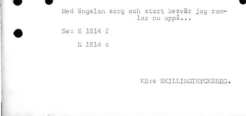 //// Med ängslan sorg och stort besvär jag ram- //// lar nu uppå.., //// BK //// K! //// ^ Se: E 1814 f //// N 1814 c //// t //// KB:s SKILLINGTRYCKSREG. //// - ////