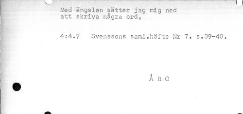 //// Med ängslan sätter jag mig ned //// att skriva några ord, //// 4:4.? Svenssons saml.häfte Nr 7. s.39-40. //// * //// i - //// ÅBO ////