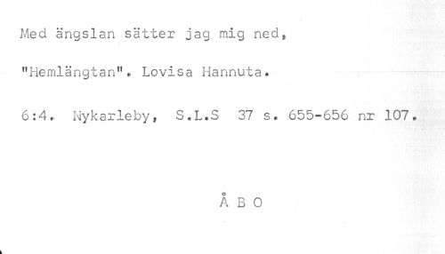 //// Med ängslan sätter jag mig neds //// "Hemlängtan". Lovisa Hannuta* //// 6:4. Nykarleby, S.L.S 37 s. 655-656 nr 107. ////