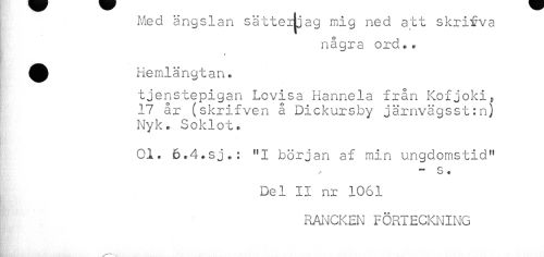 //// Med ängslan sätteijjag mig ned att skrifva //// några ord., //// ^ Hemlängtan^ //// tjenstepigan Lovisa Hannela fran Kofjoki, //// .17 år (skrifven å Dickursby järnvägsst:n) //// Nyk. Soklot. //// 01. 6.4.sj.: "I början af min ungdomstid" //// - s. //// Del II nr 1061 //// RANCKEN FÖRTECKNING ////