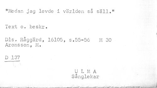 //// "Medan jag levde i världen så säll*" //// Text o< beskr * //// Dis. Råggärd, 16105, s,55-56 M 30 //// Aronsson, M. //// D^.137 //// < t - : //// .f //// U L M A //// Sånglekar ////