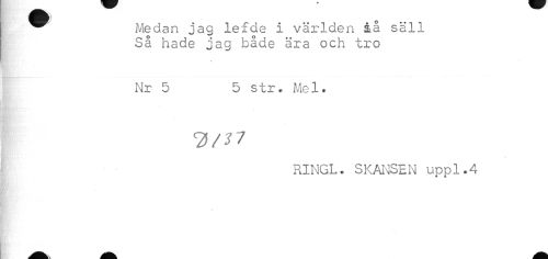 //// ^^ Medan jag lefde i världen i.a säll //// Så hade jag både ära och tro //// Nr 5 5 str. Mel. //// RINGL. SKANSEN uppl.4 //// - ////