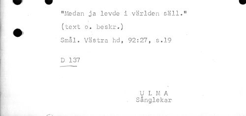 //// "Medan ja levde i världen säll." //// t //// } (text o. beskr.) //// Smål„ Västra hd, 92:27, s.,19 //// D 137 //// g //// U L M A //// Sånglekar ////