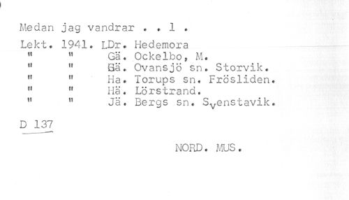 //// Medan jag vandrar . . 1 . //// Lekt. 1941. LDr* Hedemora //// " " Gä. Ockelbo, M. //// " " Bä. Ovansjo sn. Storvik. //// " " Ha. lorups sn. Frosliden. //// " " Hä. Lörstrand. //// " " Ja. Bergs sn. S^enstavik. //// D 137 //// NORD. MUS. ////