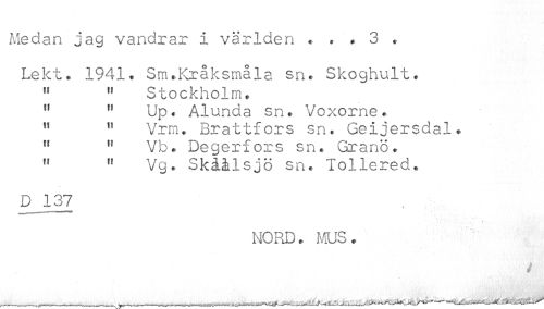 //// Medan jag vandrar i världen ... 3 . //// Lekt. 1941. Sm.Kråksmåla sn. Skoghult. //// " " Stockholm. //// " Up. Alunda sn. Voxorne. //// " " Vrm. Brattfors sn. Geijersdal. //// " " Vb. Degerfors sn. Granö. //// " " Vg. SkåUsjö sn^ lollered. //// D 137 //// NORD. MUS. //// , .....^......^ -.A.., -----....^...A....-,;.....,^* ////