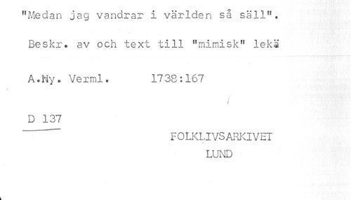 //// "Medan jag vandrar i världen sa säll". //// Beskr. av och text till "mimisk" iekä //// A*Ny* Verml. 1738:167 //// f //// D 137 //// "" FOLKLIVSARKIVEI //// 7* //// LUND //// k ////