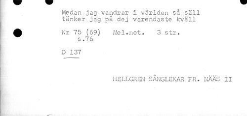 //// Medan jag vandrar i världen så säll //// tänker jag på dej varendaste kväll //// ^ Nr 75 (69) Mel.not. 3 str. //// ! s.76 //// D 137 //// HELLGREN SÅNGLEKAR FR. NÄÄS II ////