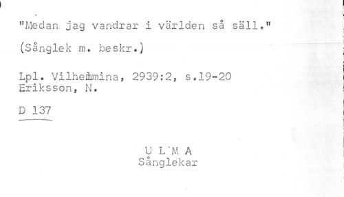 //// t //// < //// "Medan jag vandrar i världen så säll*" //// < //// (Sånglek m. beskr.) ^ //// Lpl. Vilhelmina, 2939:2, s,19-20 ! //// Eriksson, N+ //// D 137 ! //// ! //// U L"M A //// Sånglekar i ////