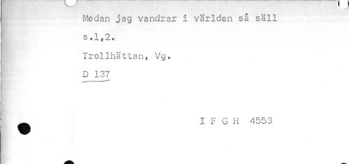 //// ) Medan jag vandrar i världen så säll //// < //// { s.1,2. //// Trollhättan, Vg. //// D 137 //// Hm^''-'' //// t ^ I F G H 4553 ////