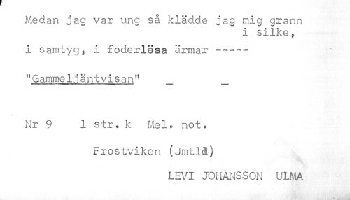 //// Medan jag var ung så klädde jag mig grann //// i silke, //// i samtyg, i foderläaa ärmar ----- //// "Gammel jäntvisan" __ __ //// Nr 9 1 str. k Mel. not. //// Frostviken (Jmtlå) //// LEVI JOHANSSON ULMA ////
