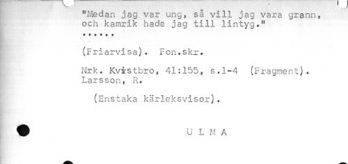 //// "Medan jag var ung, så vill jag vara grann, //// och kamrik hade jag till lintyg." //// * * * * w ^ //// (Friarvisa). Fon.skr. //// Nrk, Kvistbro, 41:155, s.1-4 (Fragment). //// Larsson, R. //// (Enstaka kärleksvisor). ////