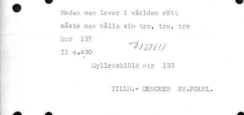 //// ^ Medan man lever i världen rätt //// måste man hålla sin tro, tro, tro //// . //// N:r 137 , //// II s.430 //// V //// Gyllenskiöld n:r 133 //// . //// * //// TILLH.- DENCKER SV.FOLKL. ////