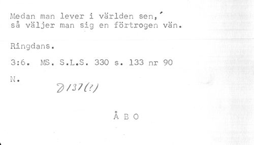 //// Medan man lever i världen sen,' //// så väljer man sig en förtrogen vän. //// Ringdans. //// 3:6. MS. S.L.S. 330 s. 133 nr 90 ////