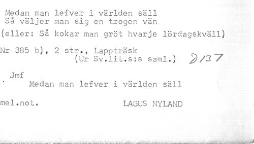 //// Medan man lefver i världen säll //// Så väljer man sig en trogen vän //// (eller: Så kokar man gröt hvarje lördagskväll) //// Nr 385 b), 2 str.. Lappträsk //// (Ur Sv,lit.s:s saml.) ^ 17 //// Jmf //// Medan man lefver i världen säll //// me1.n o t. LAGUS NYLAND ////