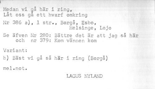 //// Medan vi gå här i ring, //// Låt oss gå ett hvarf omkring //// Nr 386 a), 1 str., Borgå, Esbo, //// Helsinge, Lojo //// Se äfven Nr 280: Bättre det är att jag så här //// och nr 379: Kom vännen kom //// Variant: //// b) Bäst vi gå så här i ring (Borgå) //// mel.not * //// LAGUS NYLAND ////