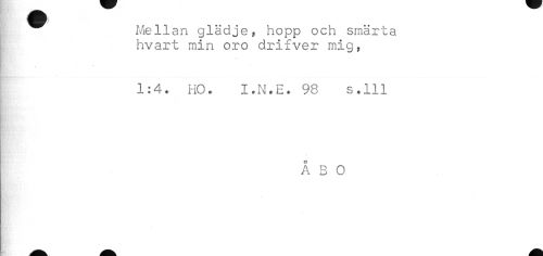 //// Mellan glädje, hopp och smärta //// hvart min oro drifver mig, //// * //// 1:4. HO. I.N.E. 98 s.lll //// ÅBO ////