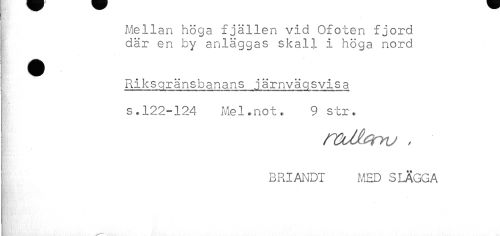 //// j Mellan höga fjällen vid Ofoten fjord //// där en by anläggas skall i höga nord //// t Riksqränsbanans järnvägsvisa //// t s.122-124 Mel.not, 9 str. //// 3 RI AI^DI MED S LÄGGA ////