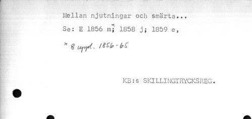 //// i Mellan njutningar och smärta... //// * //// . //// Se: E 1856 m^ 1858 j; 1859 e, //// KB:s SKILLINGIRYCKSREG. ////