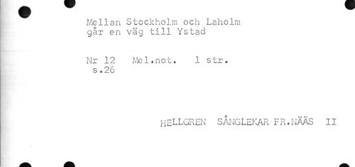 //// I Mellan Stockholm och Laholm //// ; går en väg till Ystad //// ^ Nr 12 Mel.not. 1 str. //// s.26 //// HELLGREN SÅNGLEKAR FR.NÄÄS II ////