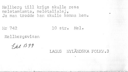 //// Mellberg till krigs skulle resa //// melotamtamta, melotalialej, //// Ja man trodde han skulle komma hem. //// Nr 742 10 str. Mel. //// Mellbergsvisan //// ^ X377 //// LAGUS NYLÄI^DSKA FOLKV. 3 //// 4 ////