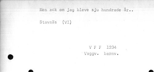 //// Men ack om jag bleve sju hundrade år.. //// * * //// * //// Stavnäs (vi) //// V F F 1234 //// ^ Vaggv. barnv. ////