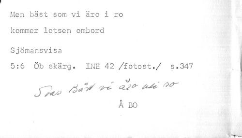 //// Men bäst som vi äro i ro //// kommer lotsen ombord //// Sjömansvisa //// 5:6 Öb skärg* INE 42 /fotost./ s.347 ^ //// ^^ ^ ^^ ^ //// Å BO ////