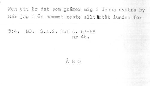 //// Men ett är det som grämer mig i denna dystra by //// När jag från hemmet reste alltåutåt lunden for //// 5:4. 30. S.L.S. 151 s. 67-68 //// nr 46. //// ÅBO ////