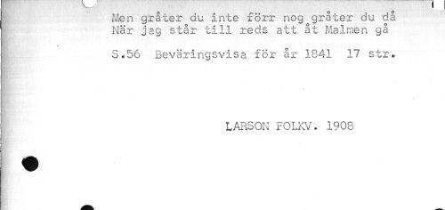 //// Men gråter du inte förr nog gråter du då //// När jag står till reds att åt Malmen gå //// * //// S.56 Beväringsvisa för år 1841 17 str. //// s //// . //// i LARSON FOLKV. 1908 ////