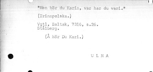 //// "Men hör du Karin, var har du vari," //// (irinnpolska *) //// * //// Vgtl, Baltak, 7316, s.26. //// Stålberg, //// (Å hör Du Kari.) ////