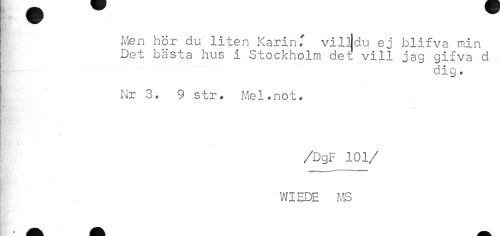 //// f ' ' //// Men hör du liten Käring villjdu ej blifva min //// Det bästa hus i Stockholm det vill jag gifva d //// dig. //// Nr 3. 9 str. Mel.not. //// - //// /DgF 101 //// /' WIEDE MS ////