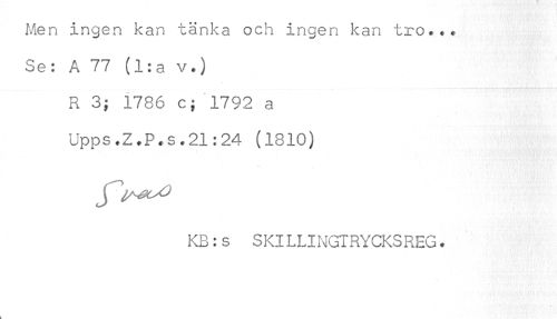 //// Men ingen kan tänka och ingen kan tro... //// Se: A 77 (l:a v.) //// R 3; 1786 c; 1792 a //// Upps.Z.P.s.21:24 (1810) //// J ^^ //// KB:s SKILLINGTRYCKSREG. //// h ////