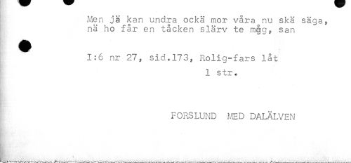 //// Men jä kan und.ra ockä mor våra nu skä säga, //// nä ho får en tåcken slärv te måg, san //// 1:6 nr 27, sid.173, Rolig-fars låt //// 1 str. //// FORSLUND MED DALÄLVEN ////