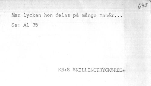 //// Men lyckan hon delas på många maner... //// * //// Se: Al 35 //// ' //// < //// ! //// 'r{ i--.'--' i //// KB:S SKILLINGTRYCKSREG^ //// ' ! //// . ' ////